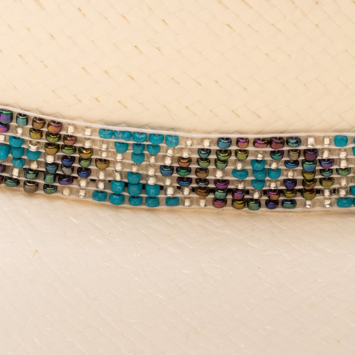 Youth Size.Ya’atah! Part of the Charlie 1 Horse Youth Collection, the Apache Jr. Hat is as much of a free spirit as she is. This shantung straw hat comes in a 4 1/8” cattleman’s crown with a 4” brim. The beaded hatband features a crisp, energizing diamondback pattern. Bright blue whip stitching adds charm and contrast to the brim. Classic vent patterning and a rusty, off-center Charlie 1 Horse brand logo complete the look. A stretchable elastic sweatband helps to ensure that she won’t outgrow it before summer’s end.