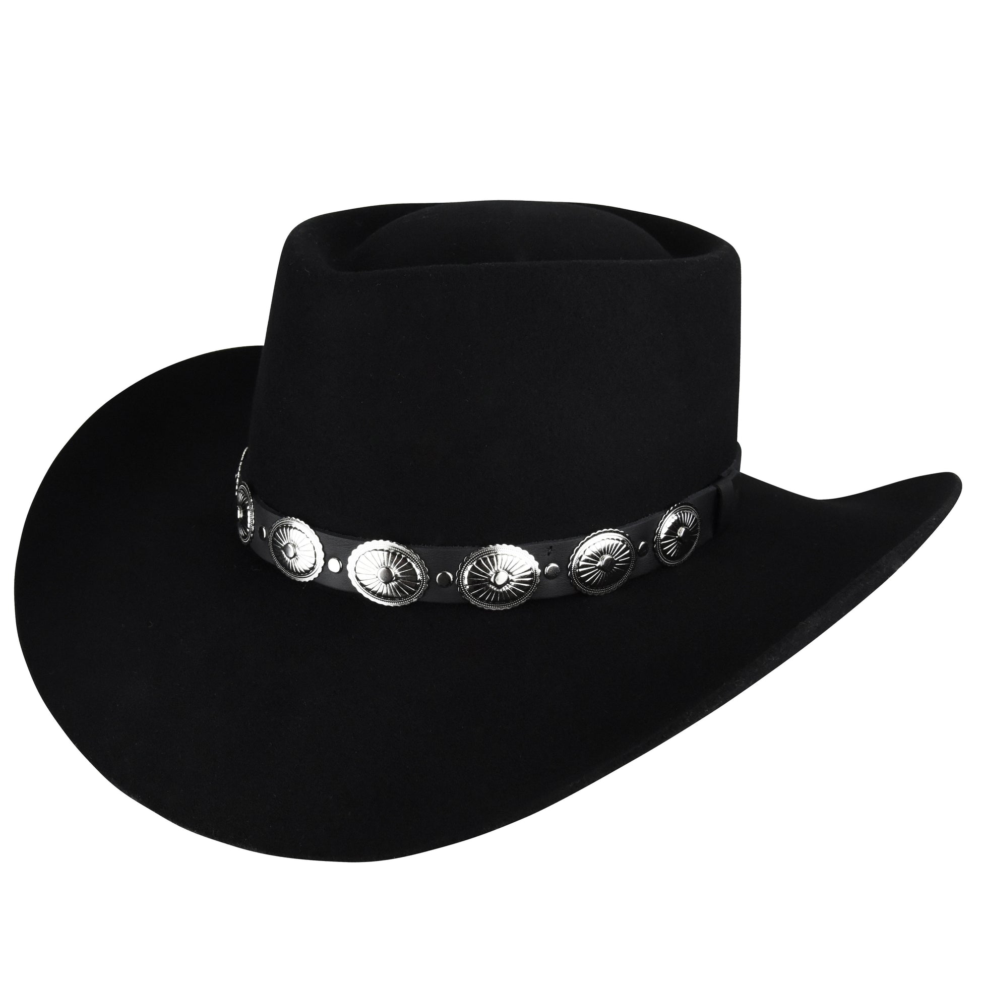 The Ellsworth is a Wool Felt with a Teardrop crown and a classic shaped 3 1/2 Inch brim. It comes with a concho and genuine leather band, giving it an Old West feel. It has a moisture-wicking sweatband and is fully lined.