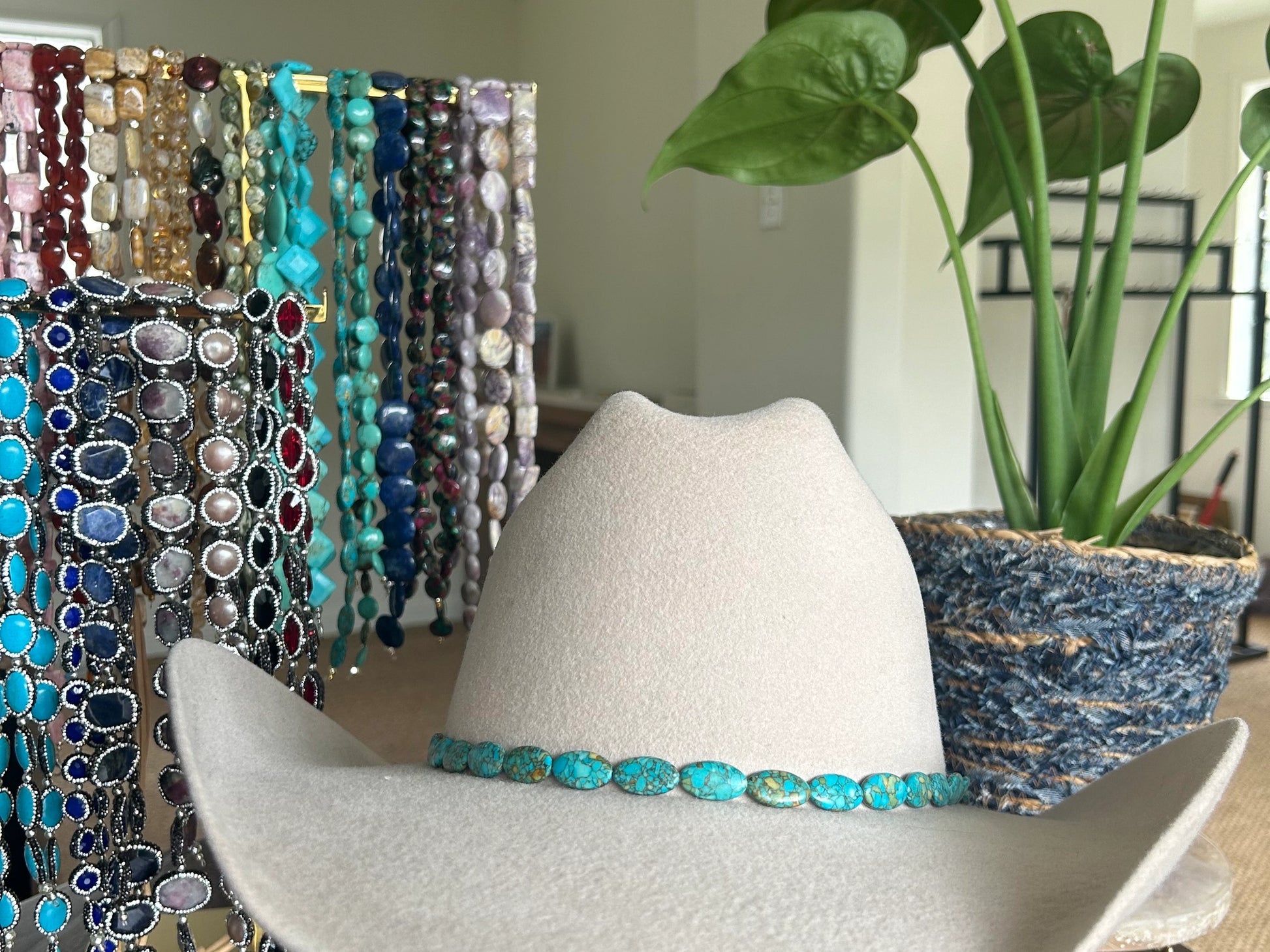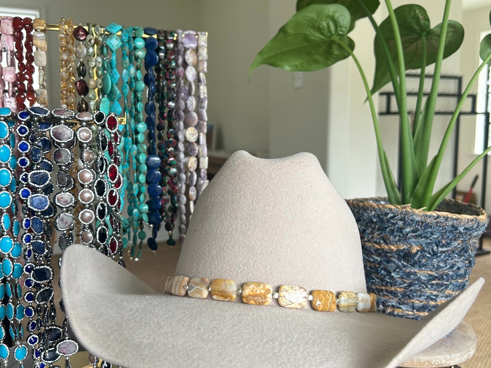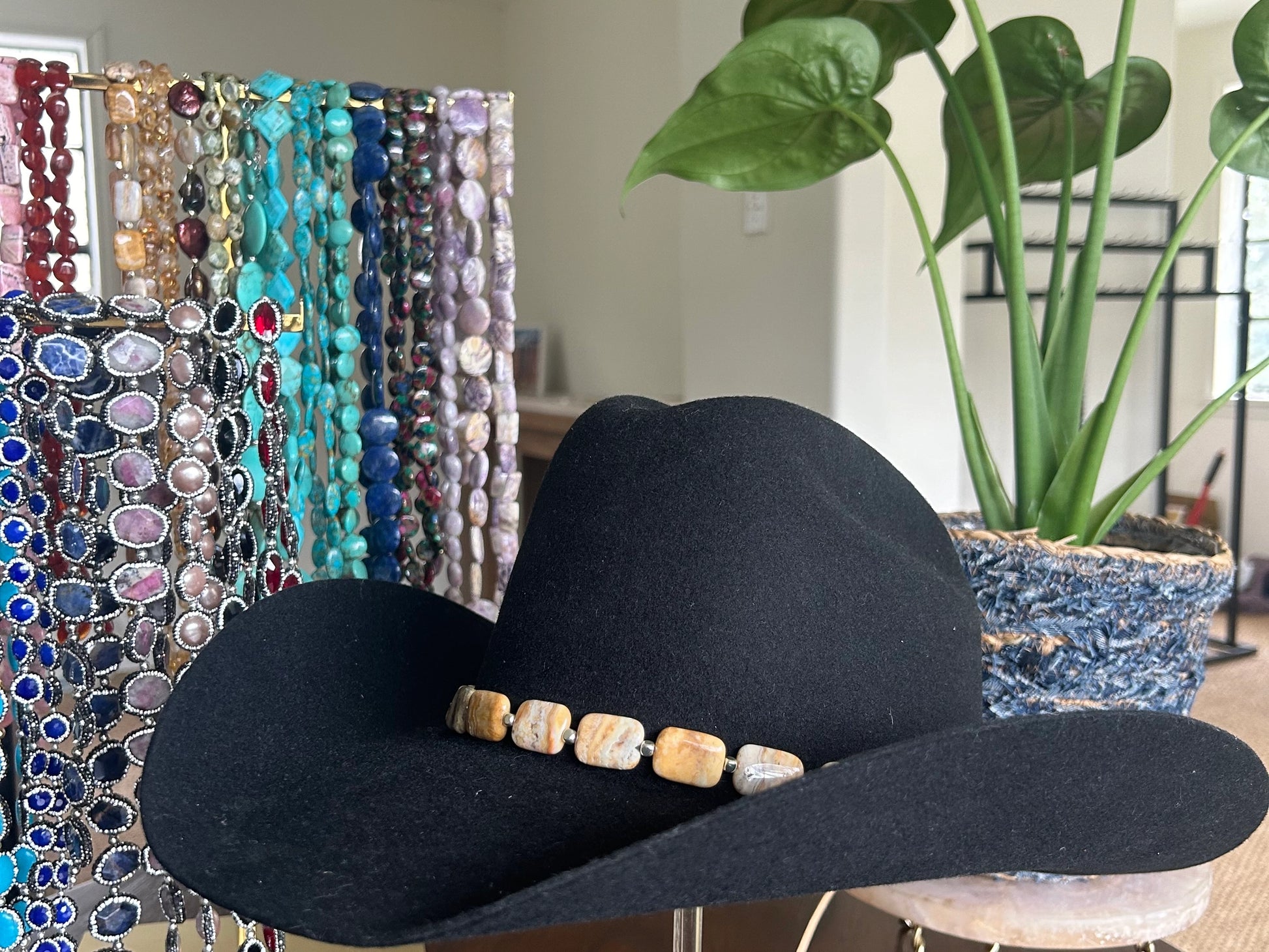 Genuine Stone handmade hat bands with gold plated silicone sliding adjuster bead for fitting most hat sizes.