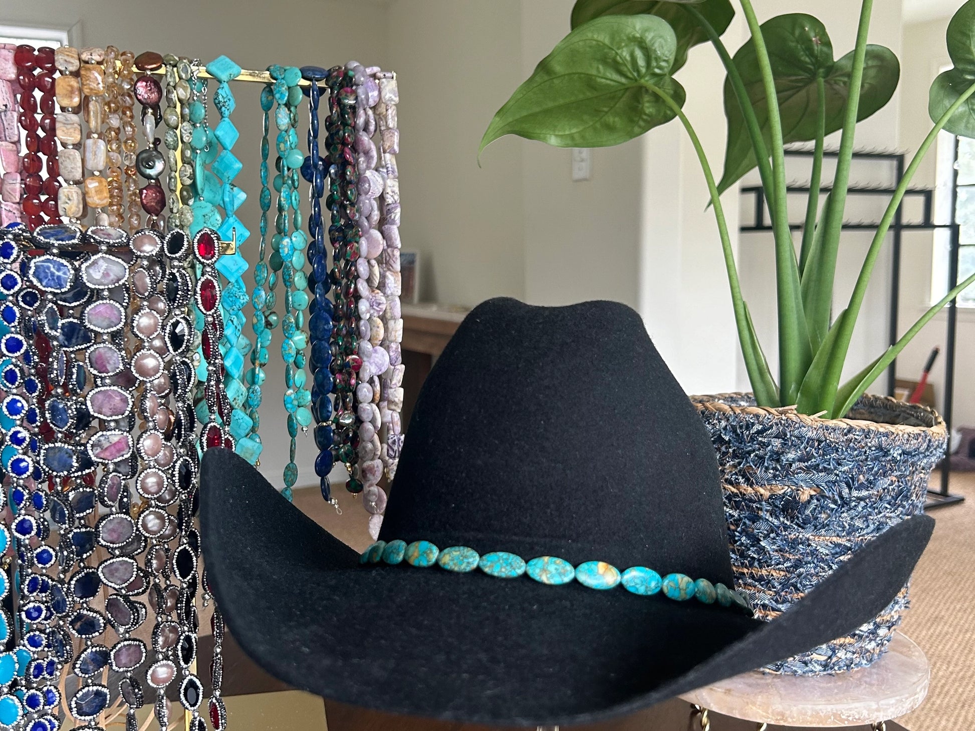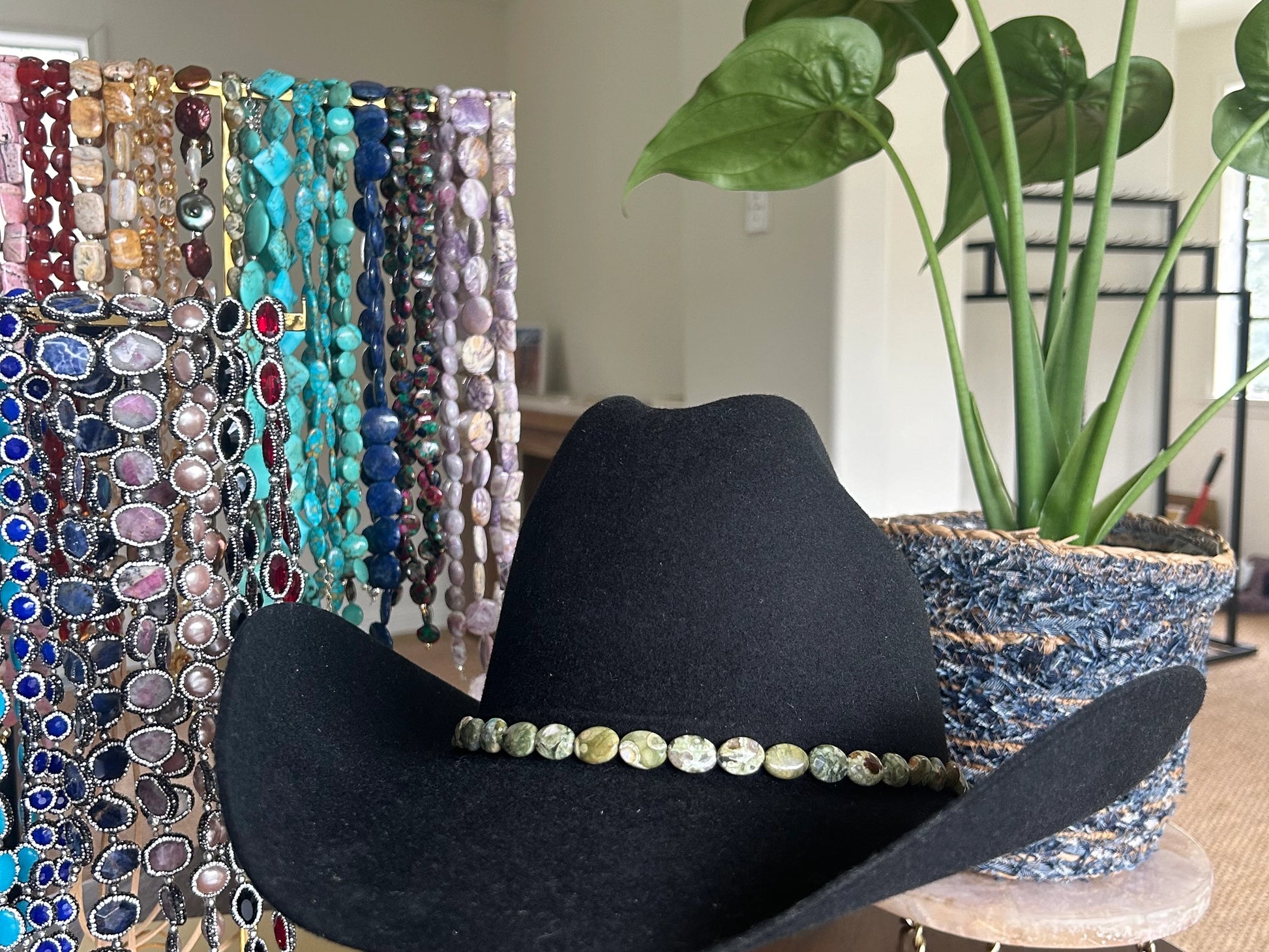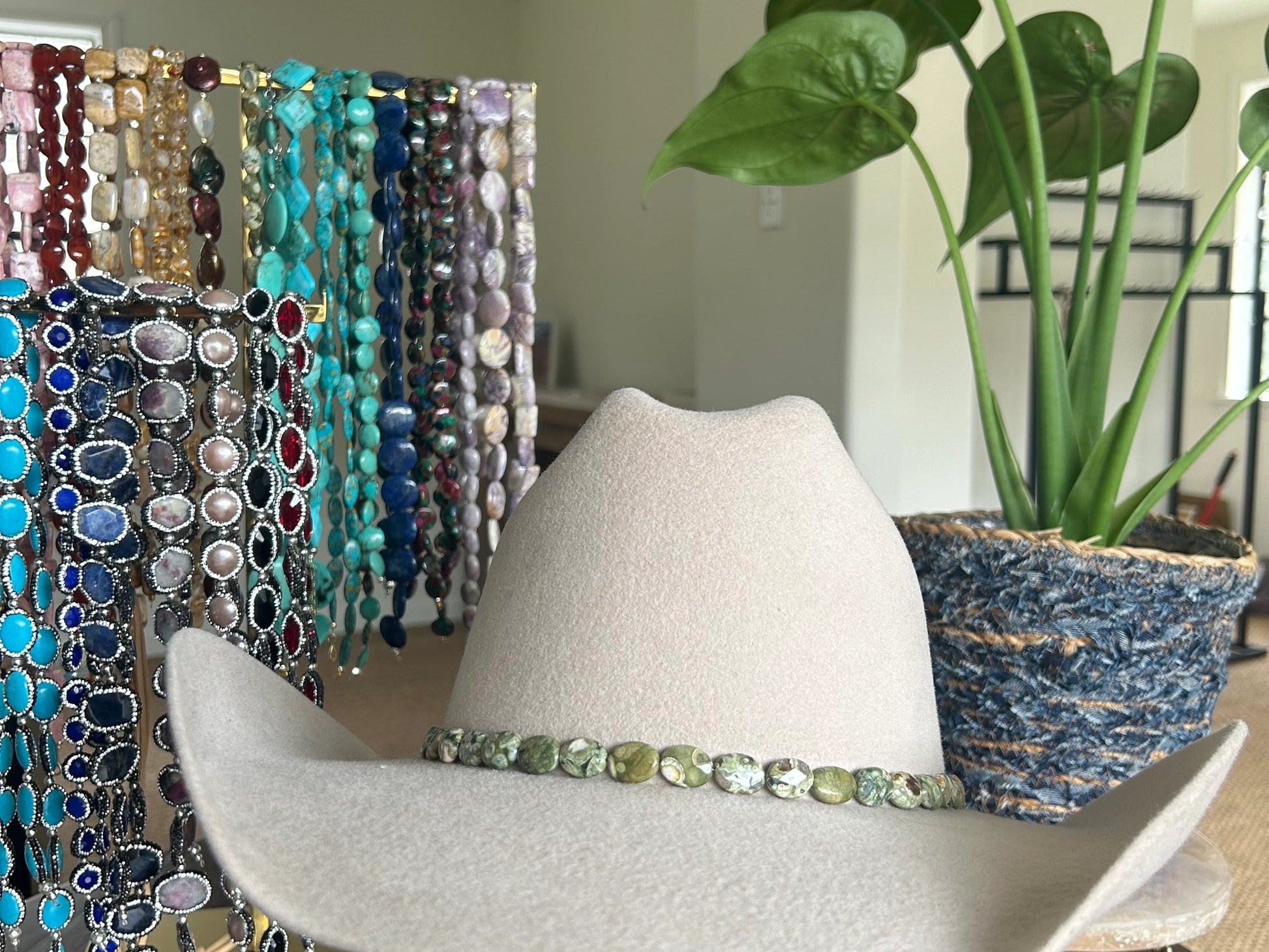 Genuine Stone handmade hat bands with gold plated silicone sliding adjuster bead for fitting most hat sizes.