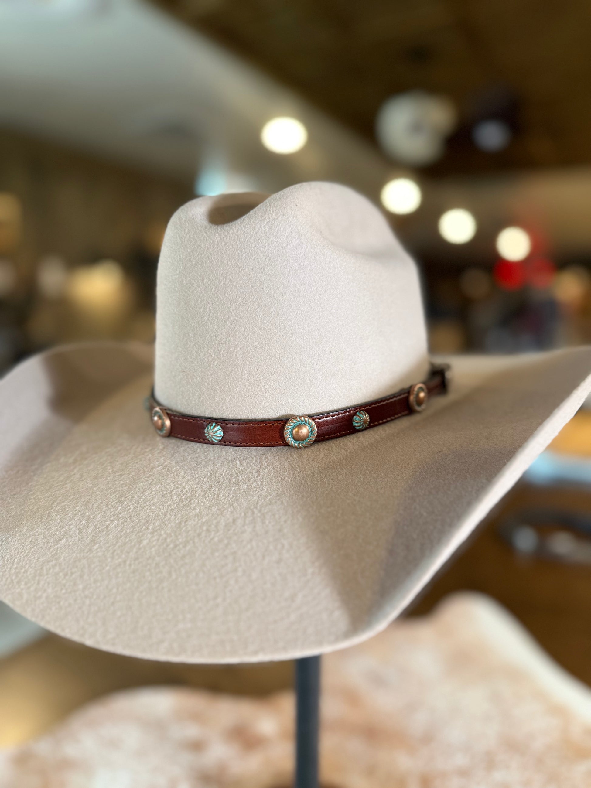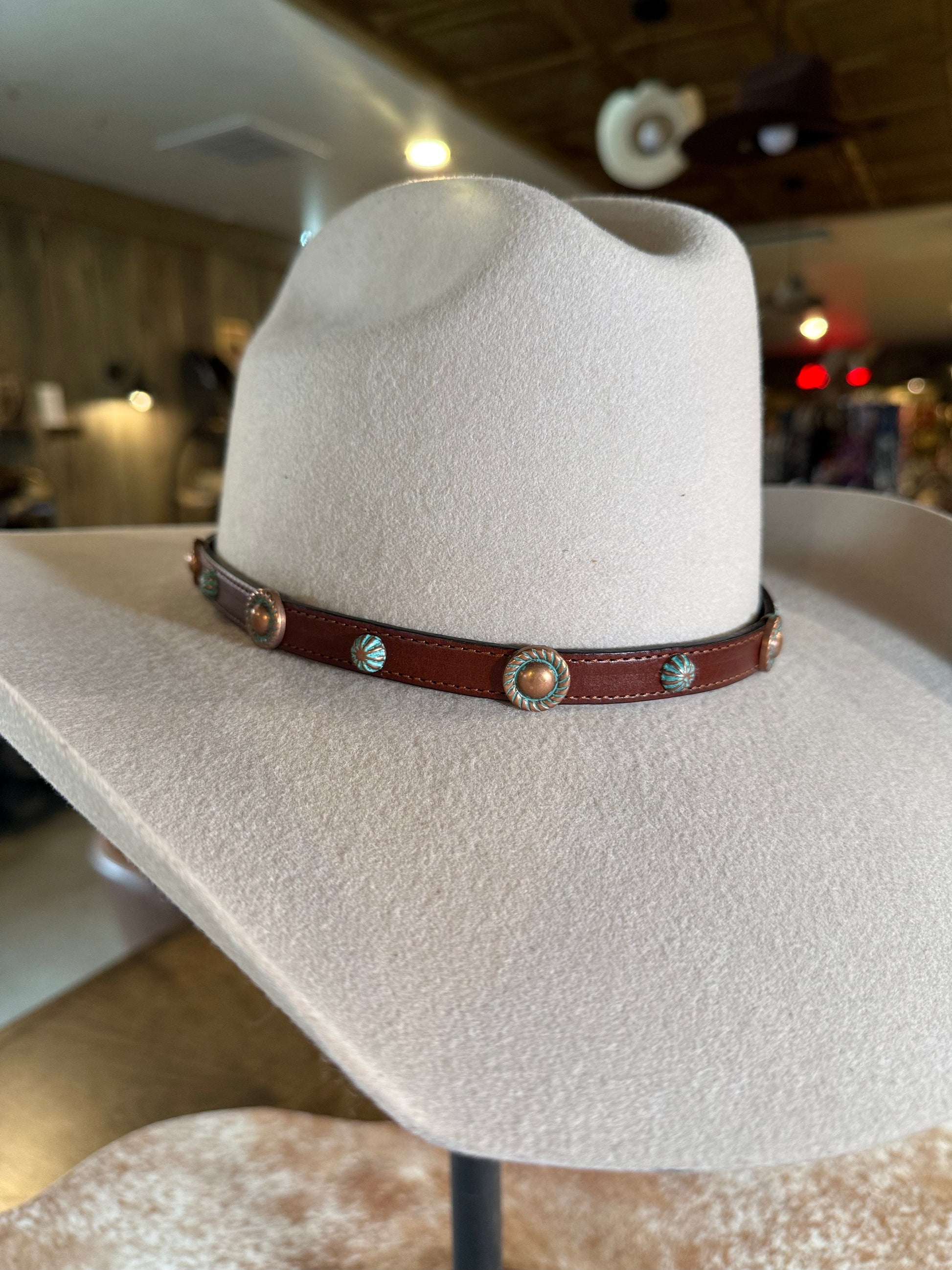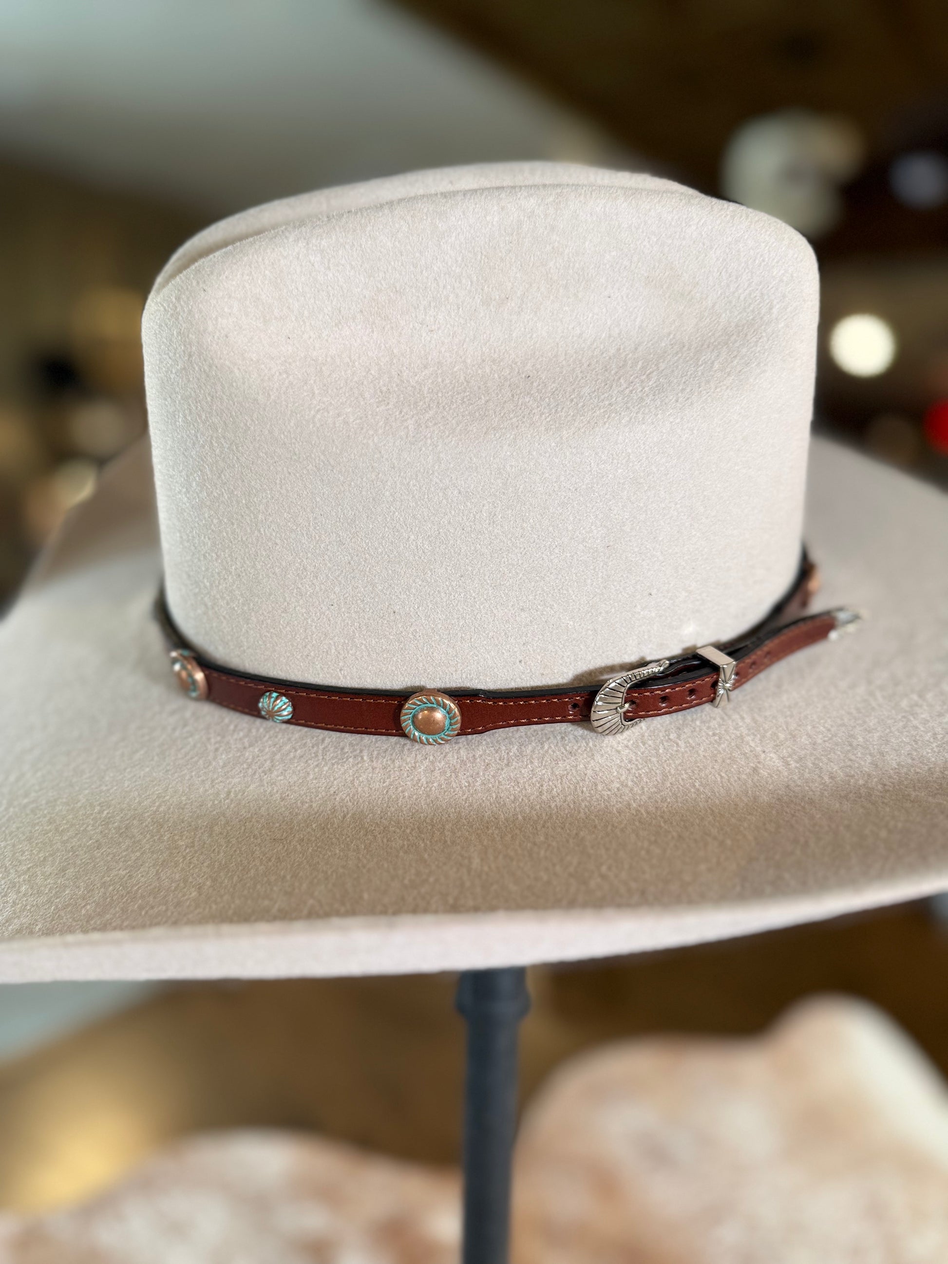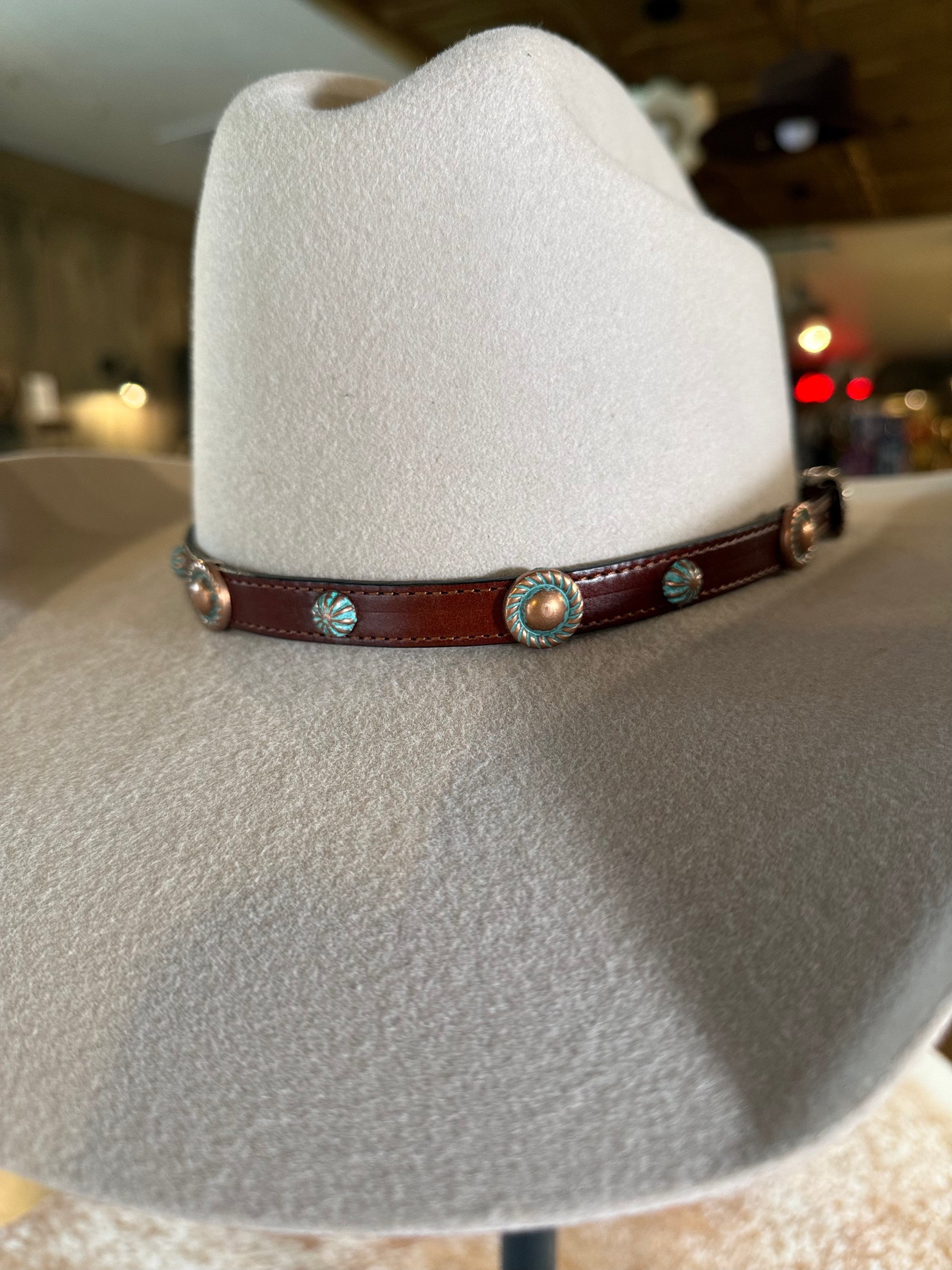 Premium finished leather. Silver buckle. Copper rivets with a hint of turquoise.