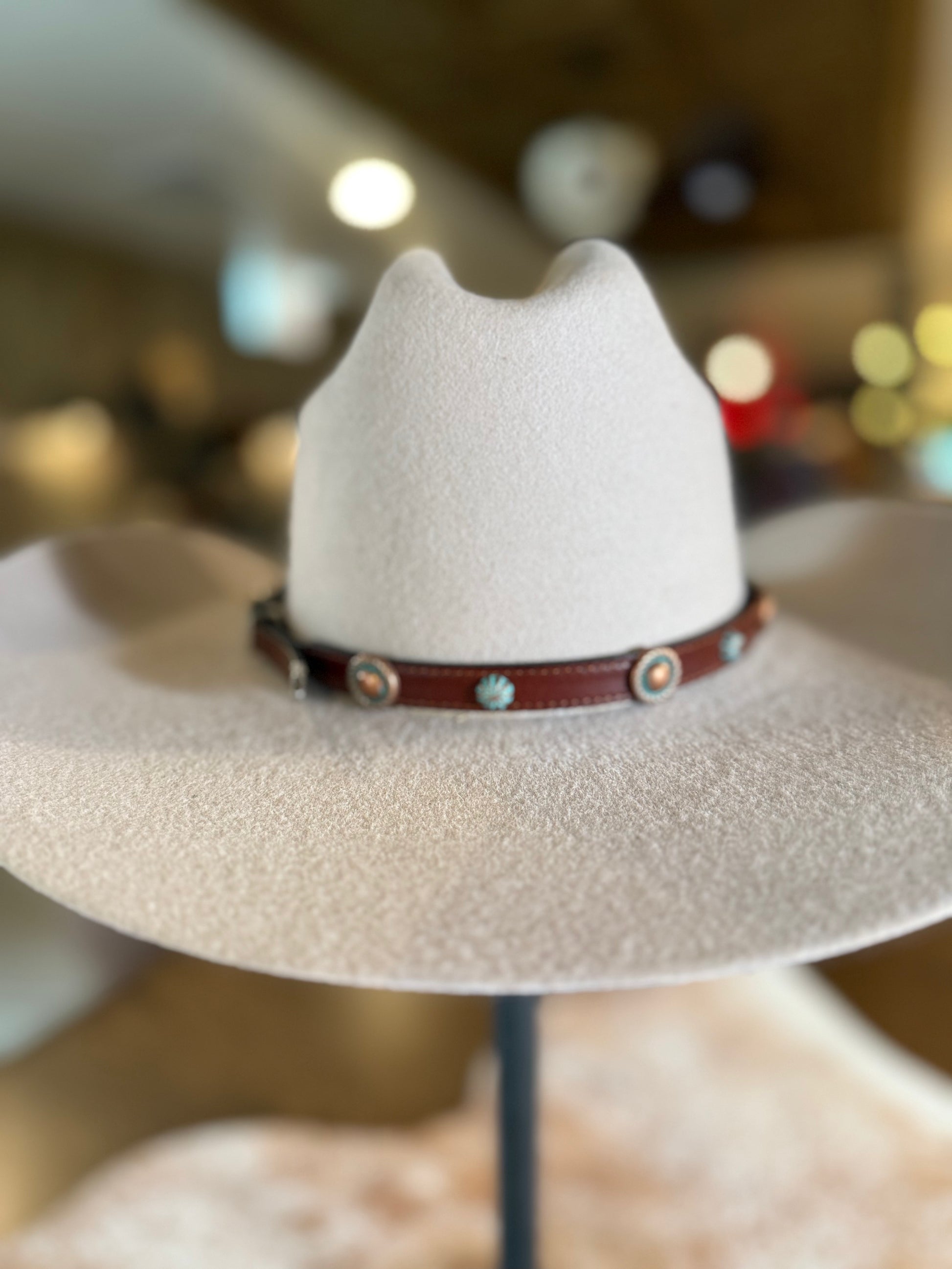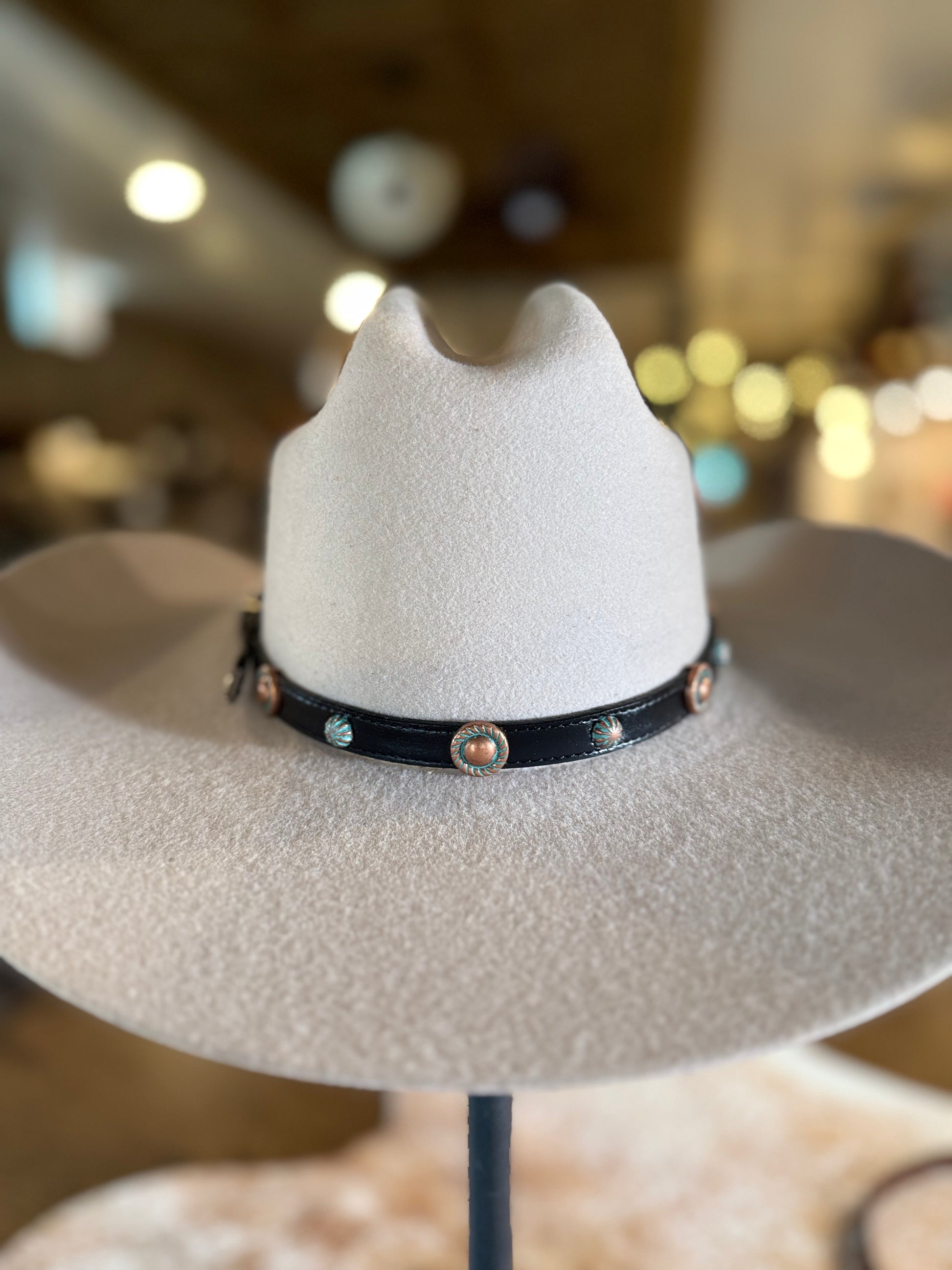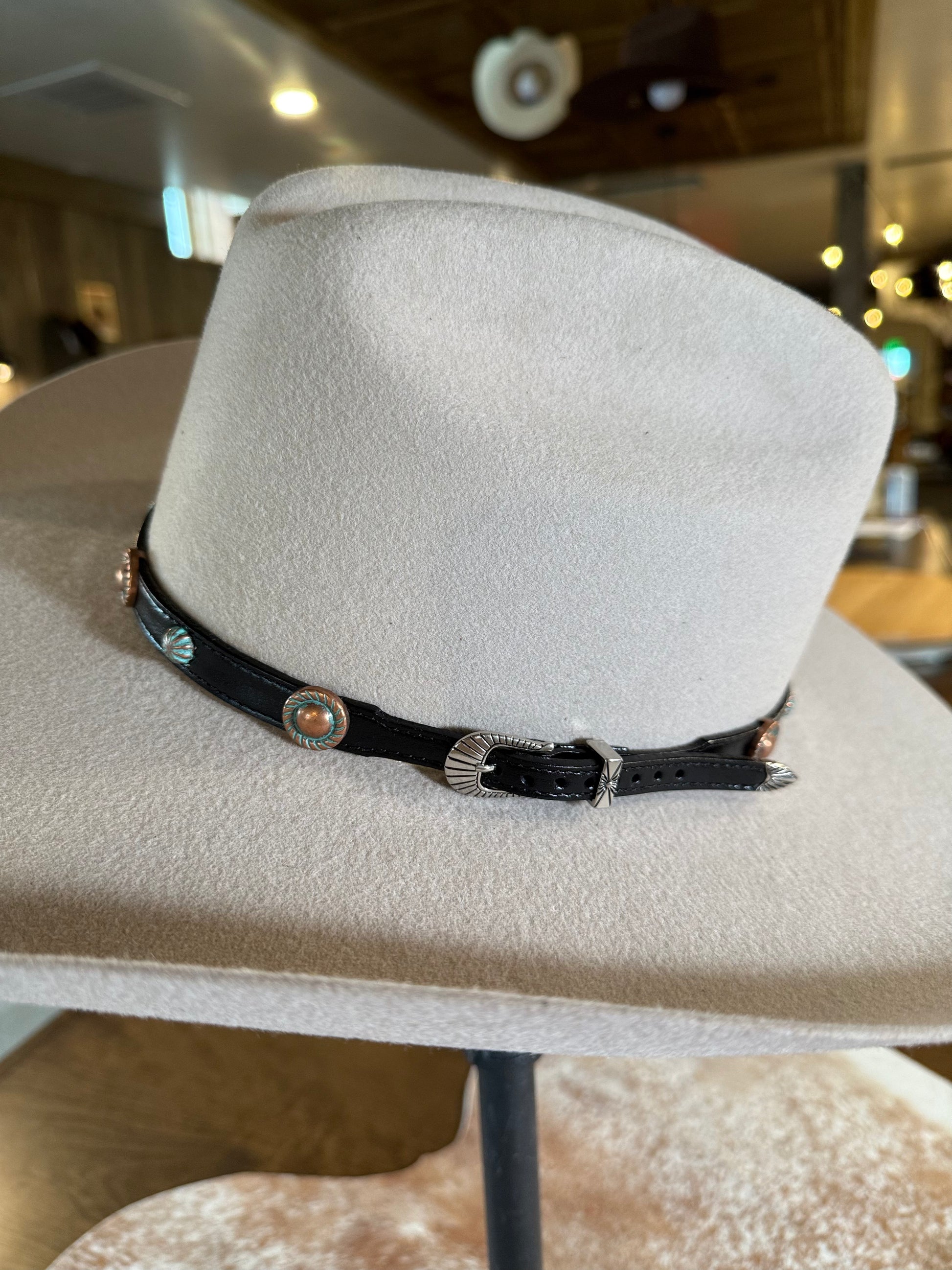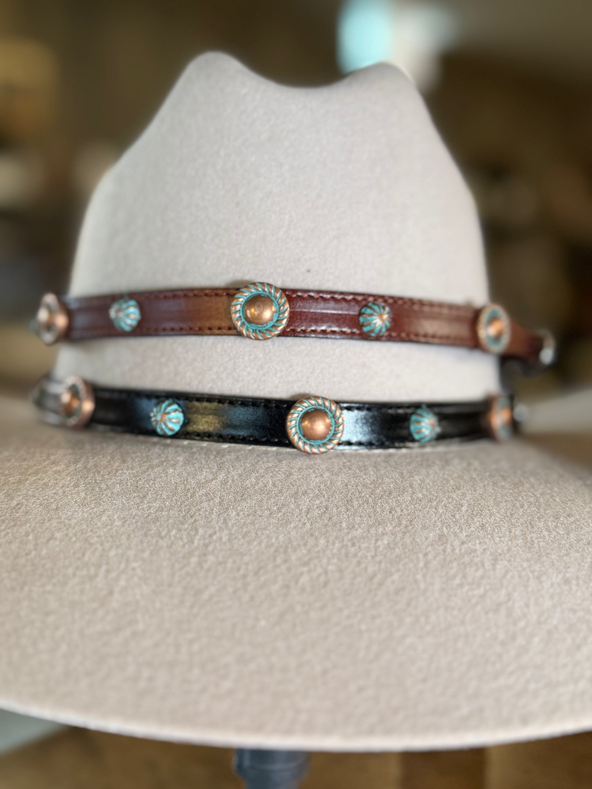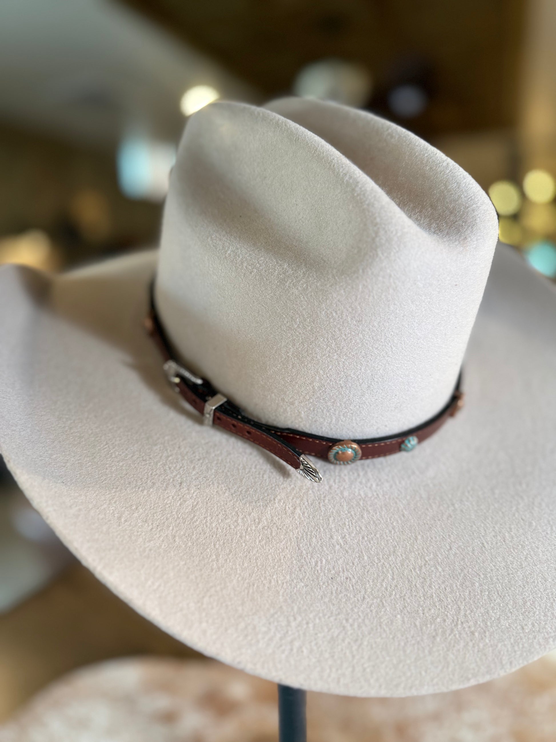 Premium finished leather. Silver buckle. Copper rivets with a hint of turquoise.