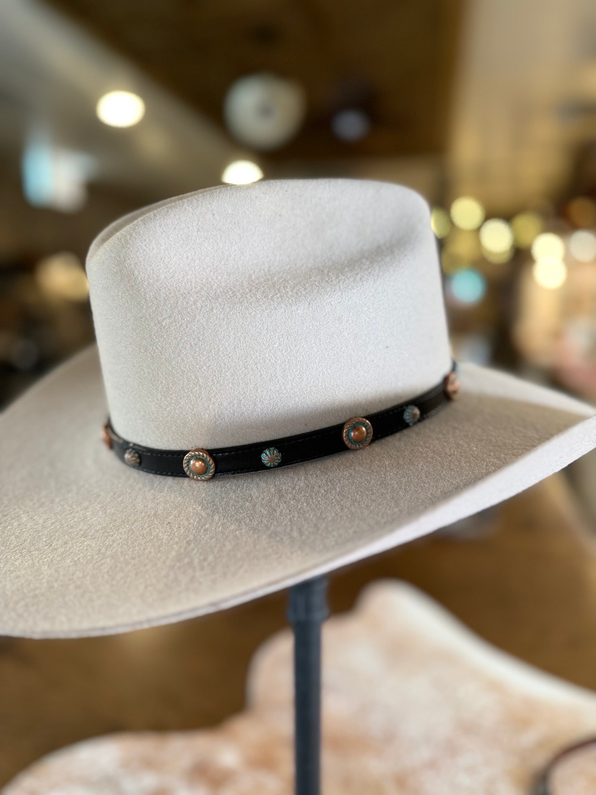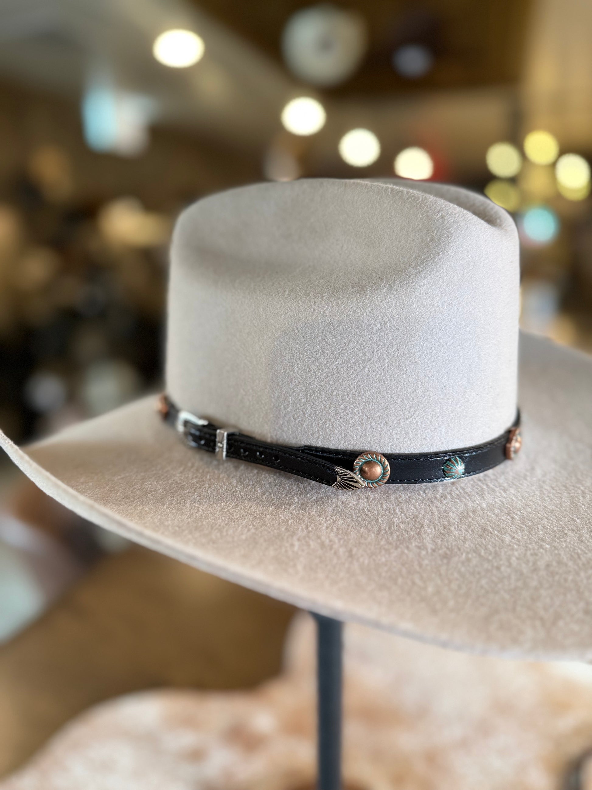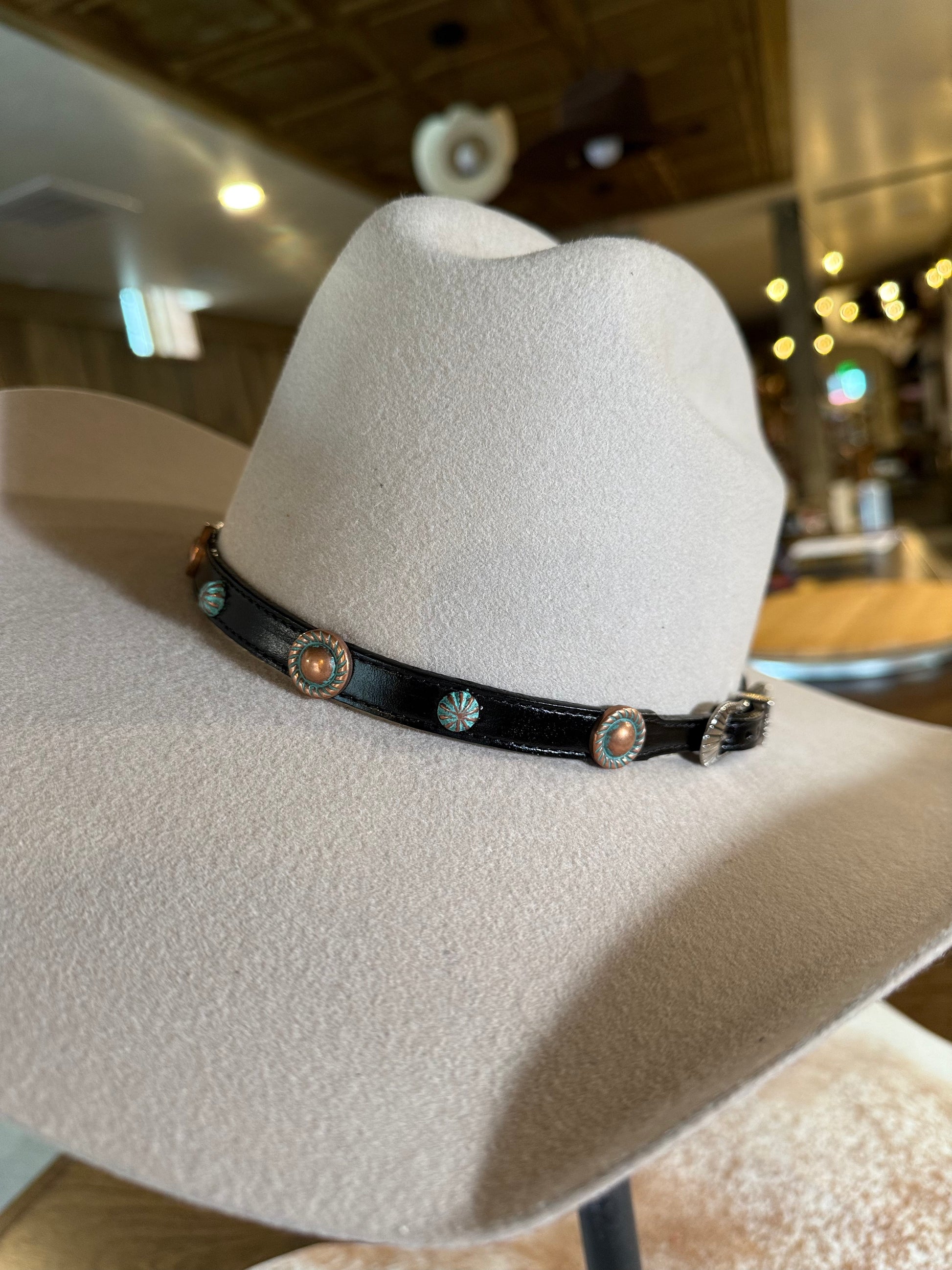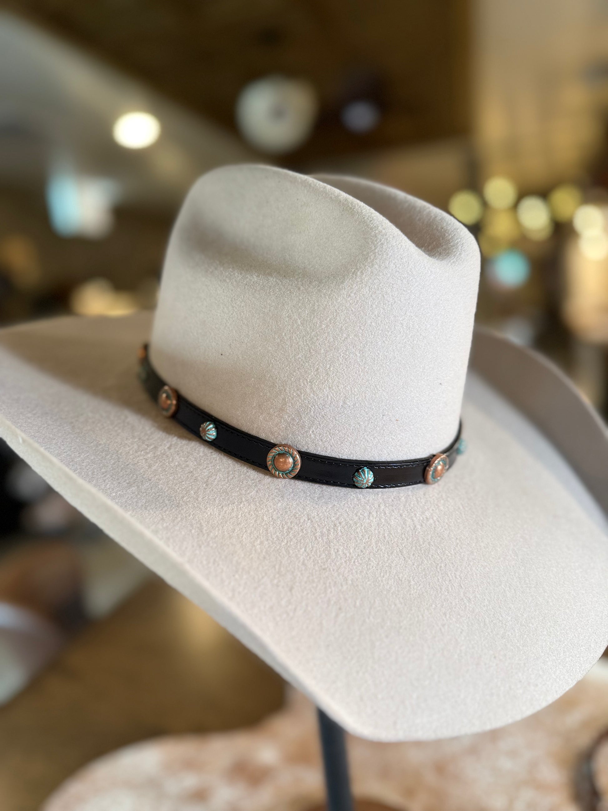 Premium finished leather. Silver buckle. Copper rivets with a hint of turquoise.