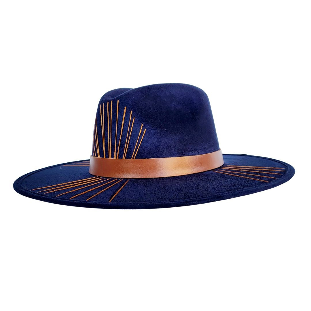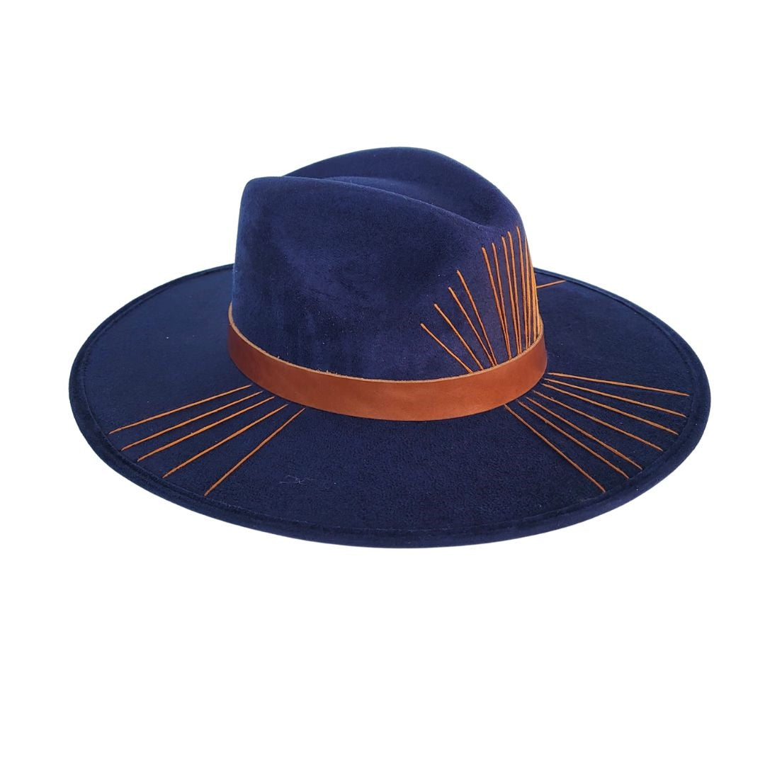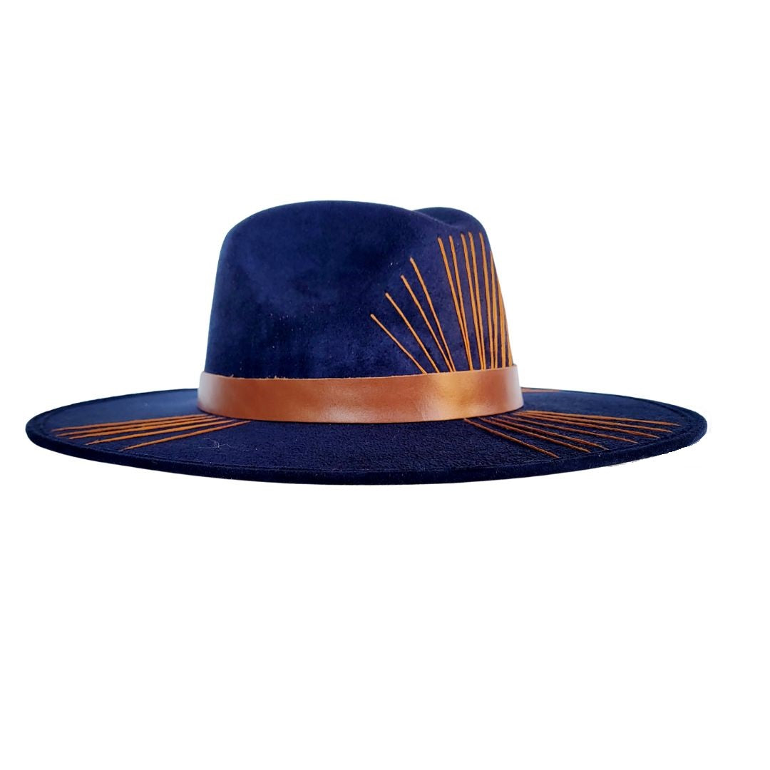 Navy polyester suede rancher hat. Brown leather and and brown delicate embroidery. Unique hat with not many produced!