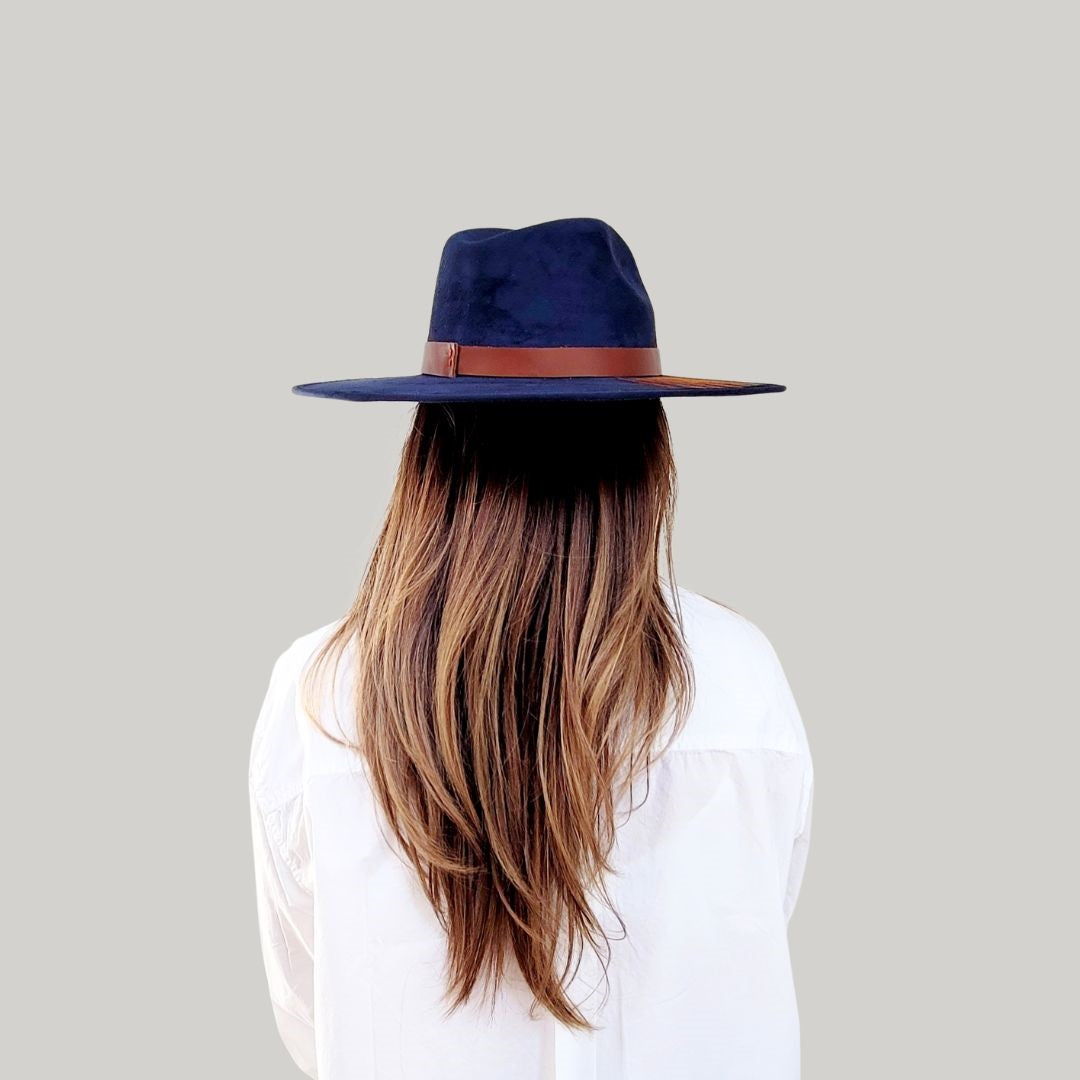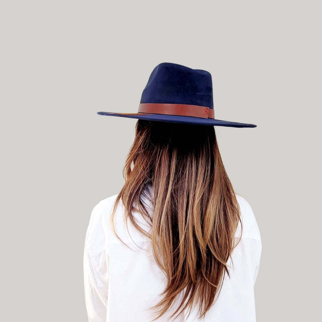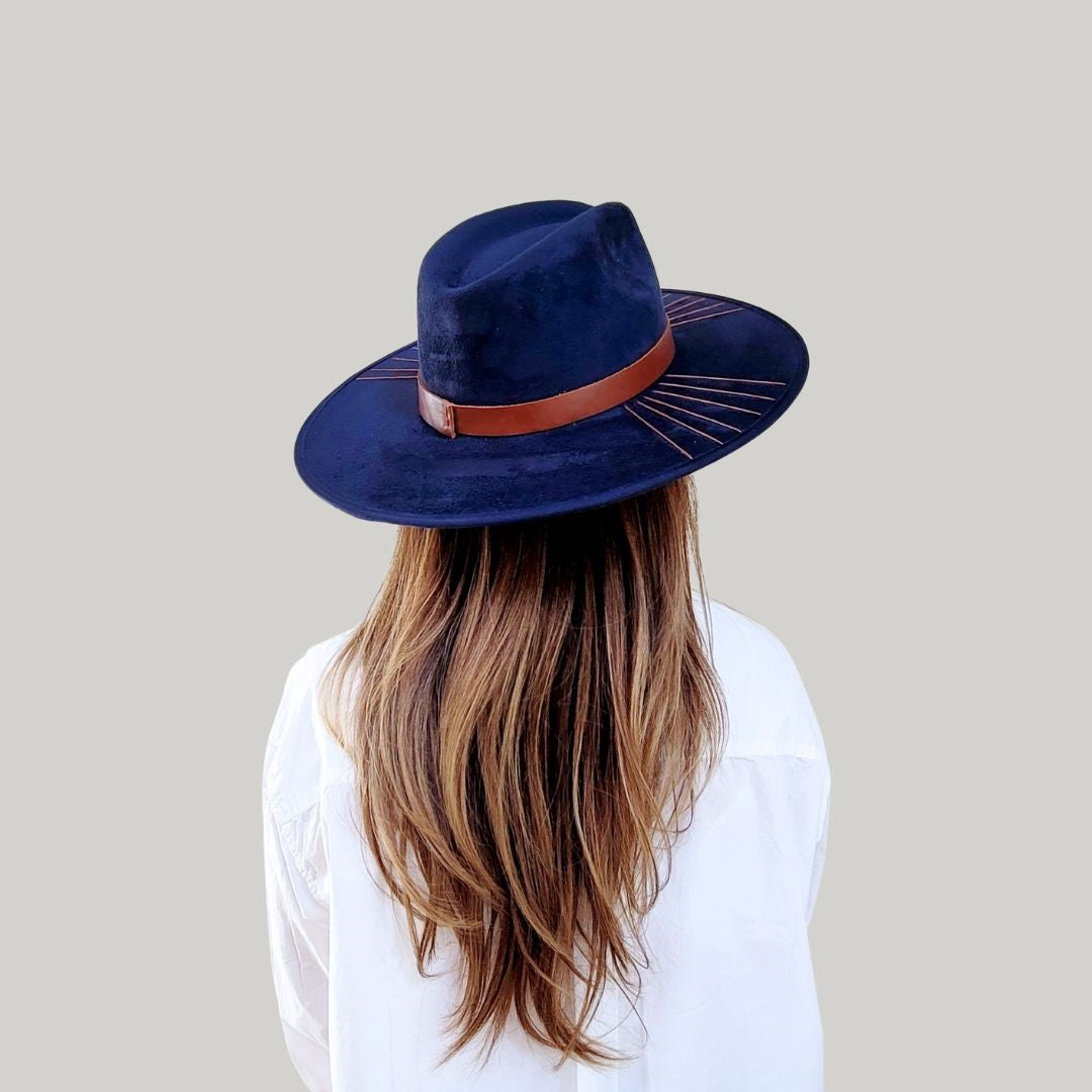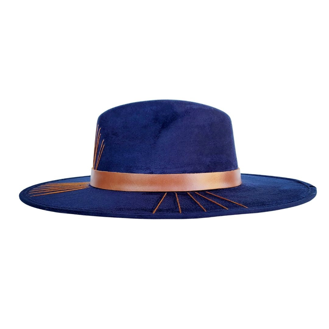 Navy polyester suede rancher hat. Brown leather and and brown delicate embroidery. Unique hat with not many produced!