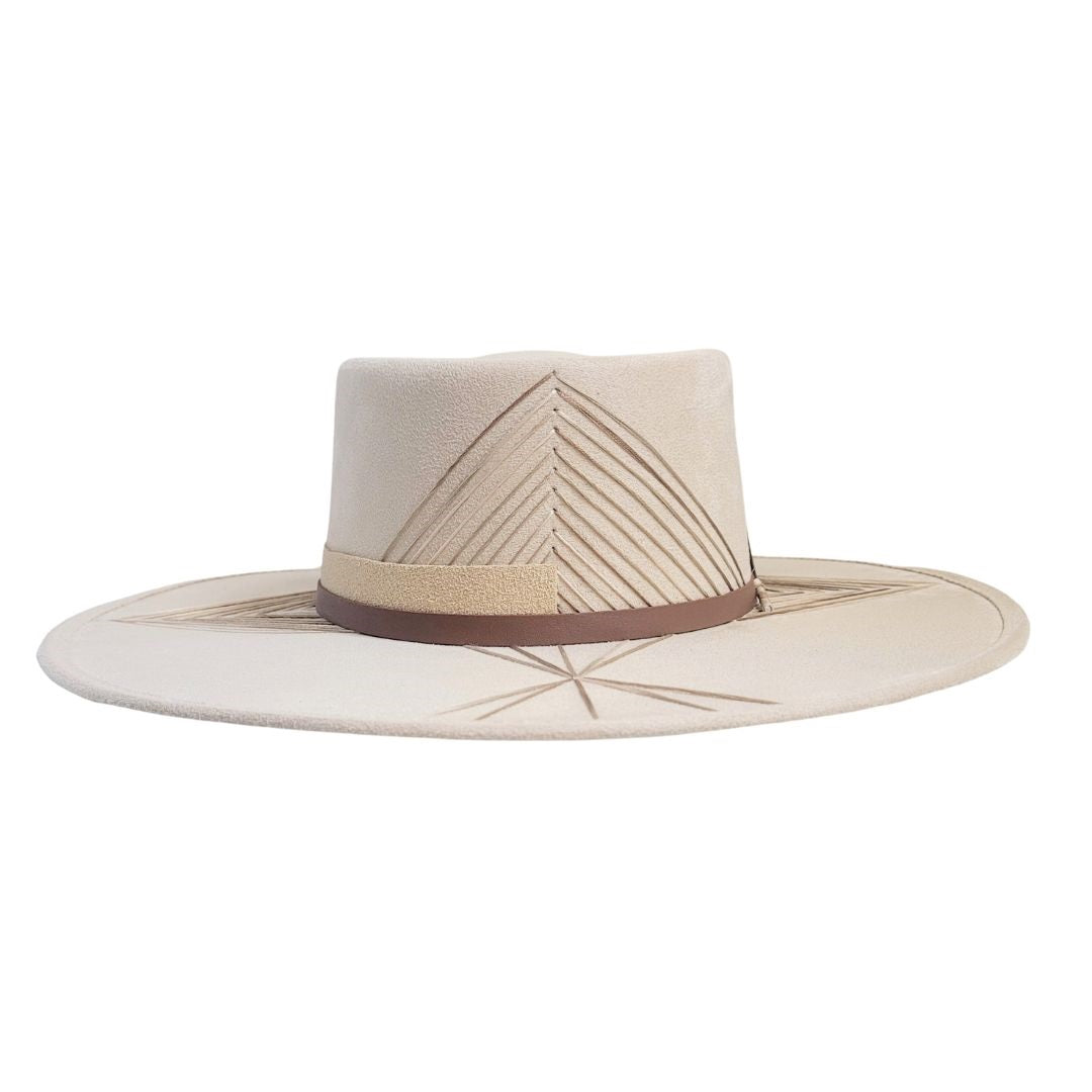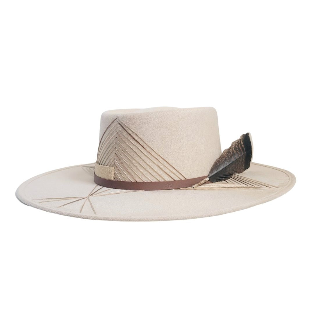 A Delicate embroidered vegan band and detail of a contemporary suede feather hat with a classic molded bolero crown.