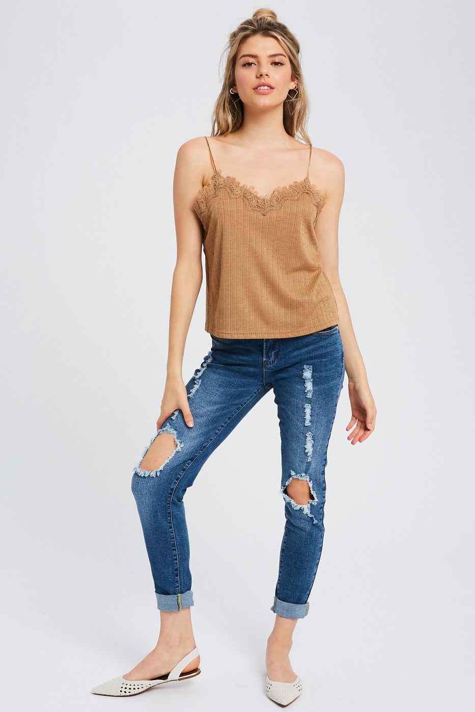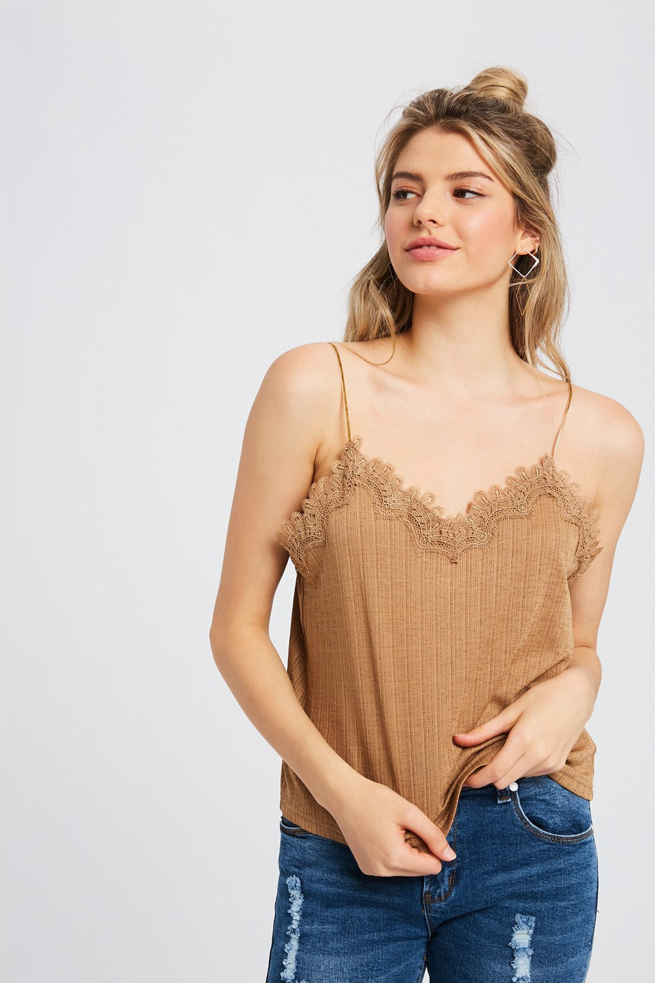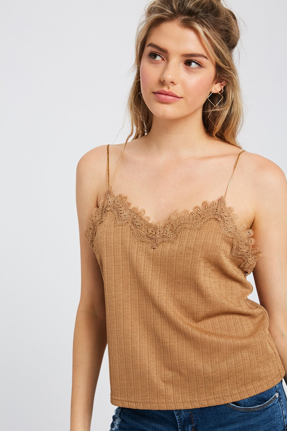 - Textured camisole with lace - Textured polyester - Adjustable shoulder strap - Crochet lace on front and back - Model is 5' 7" 32.5-25-33 and wearing a size Small