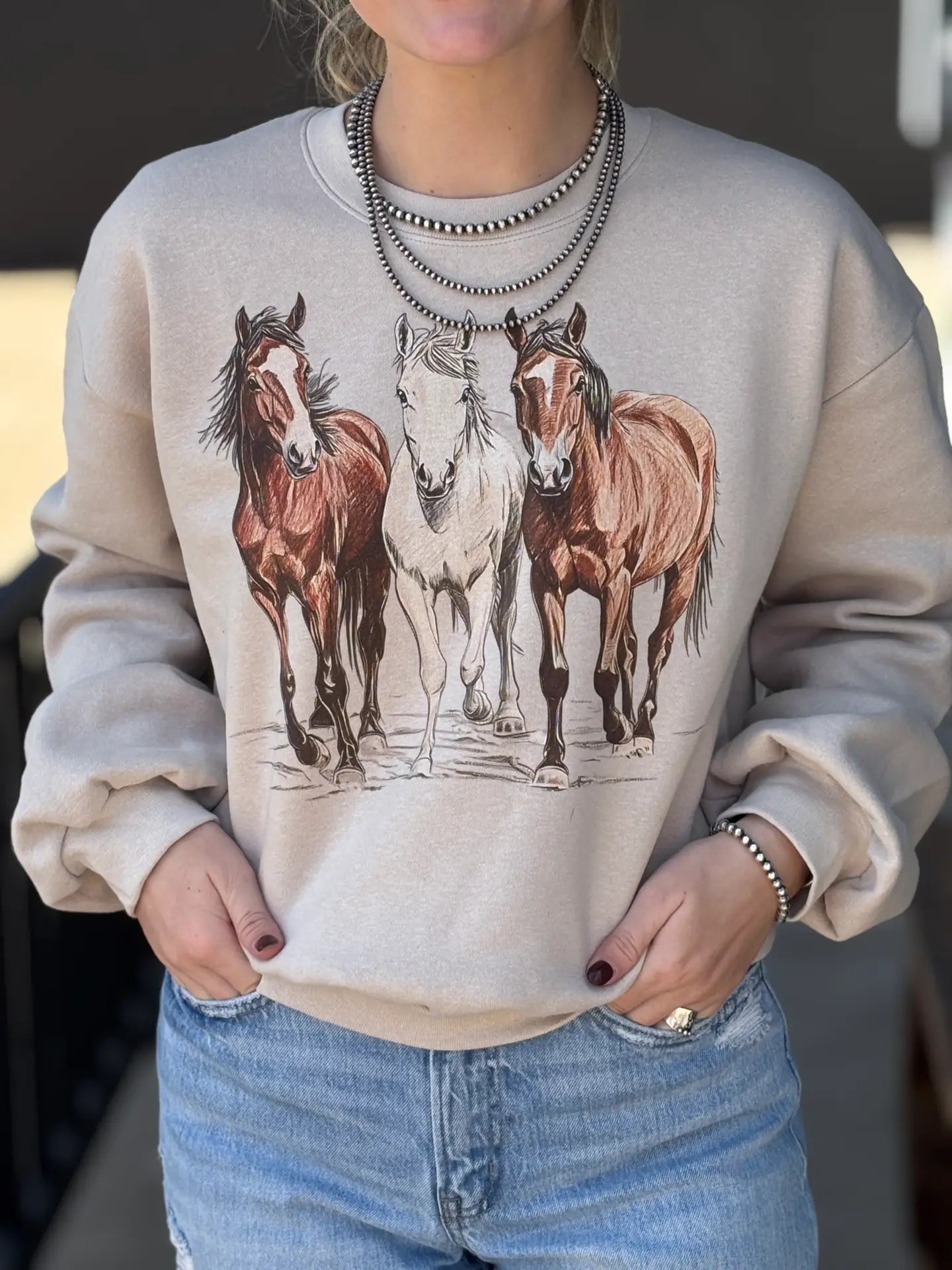 Crewneck sweatshirt featuring a wild running horses. Perfect for the horse lover!